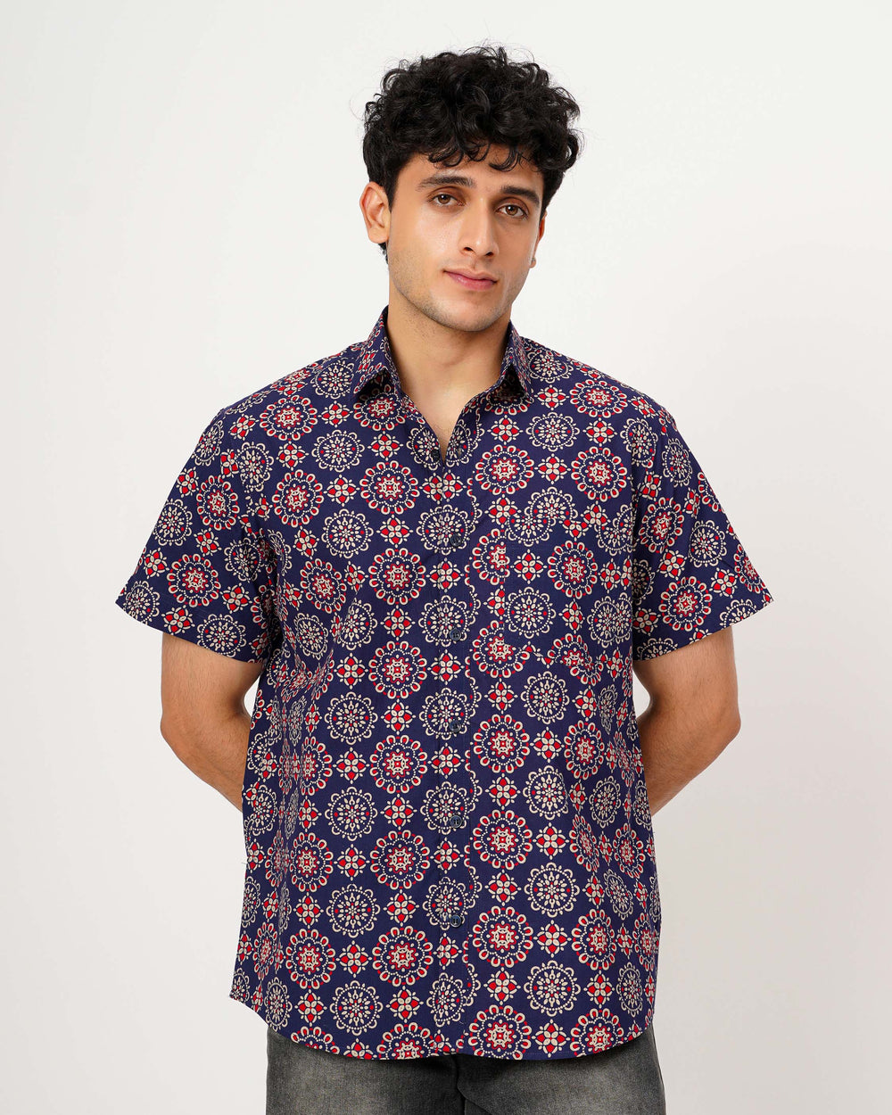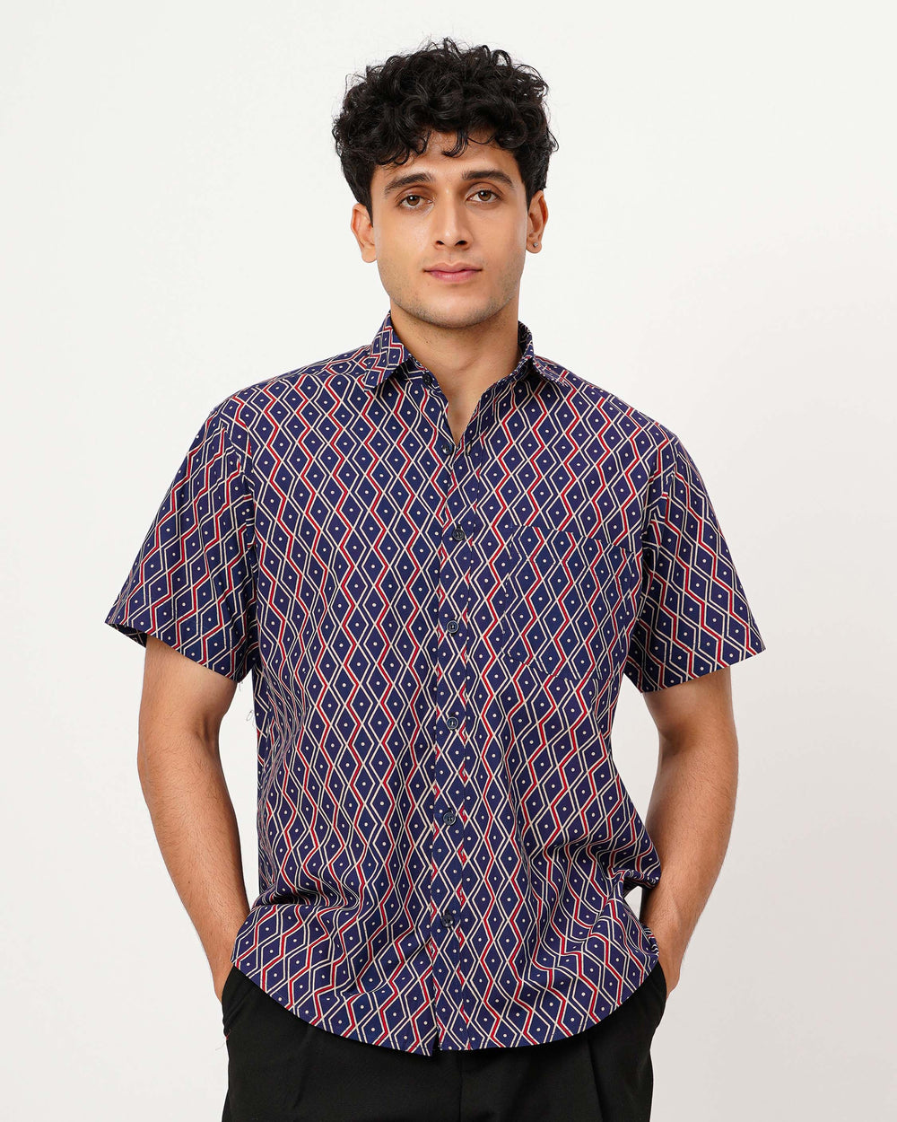 Navy Blue Ornate Cotton Poplin Half Sleeve Shirt