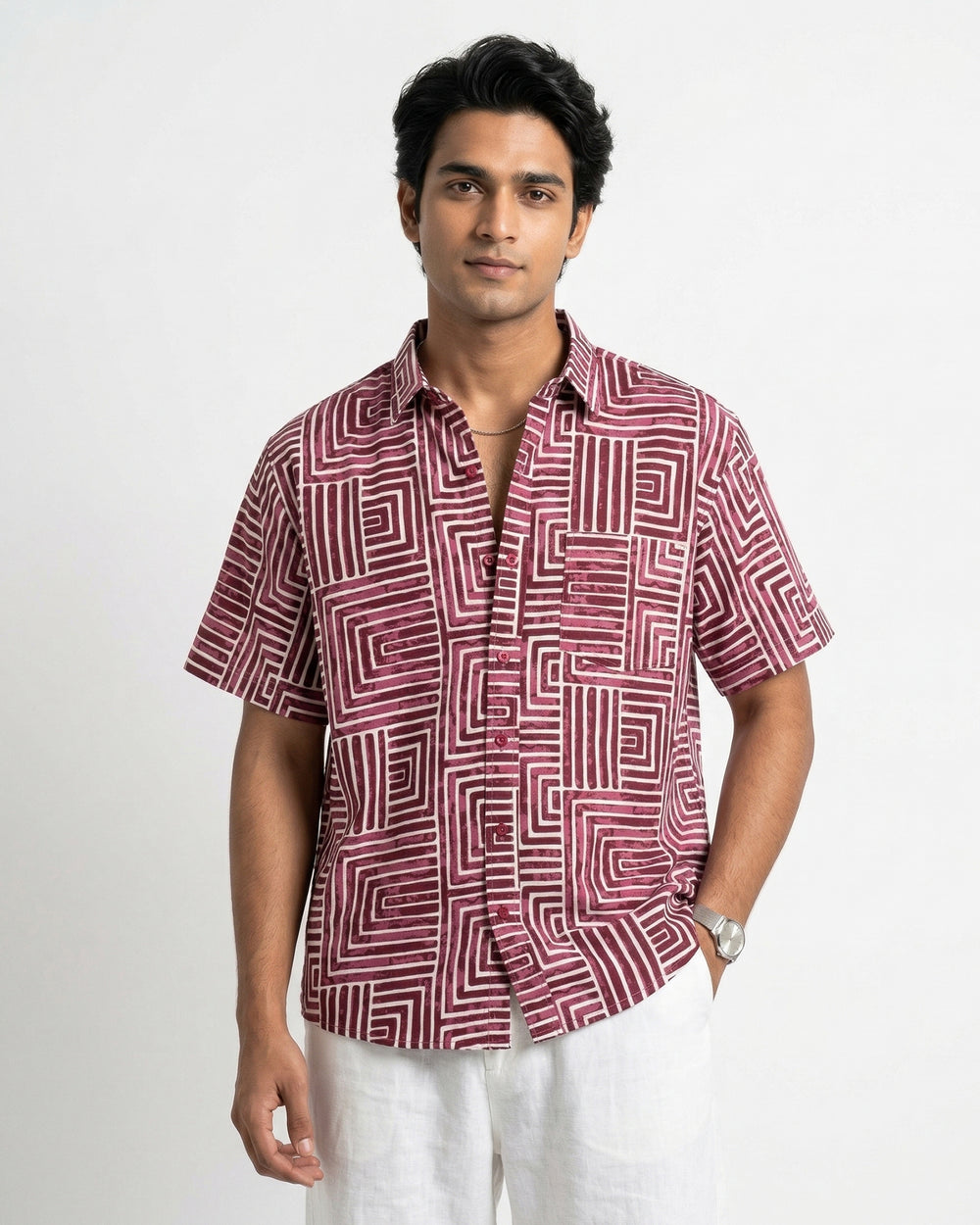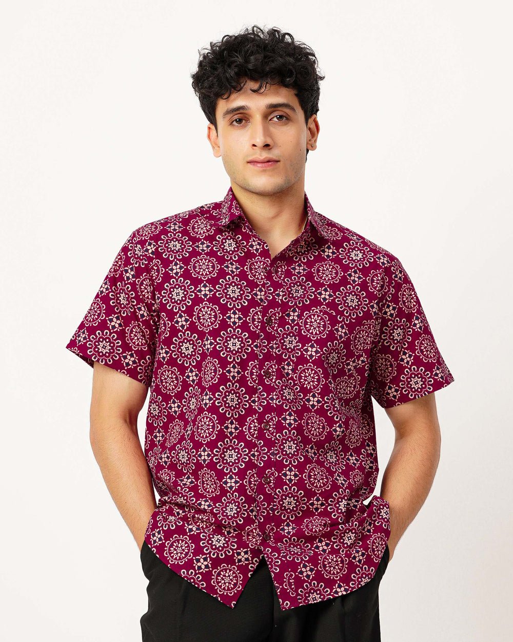 Maroon Ornate Cotton Poplin Half Sleeve Shirt