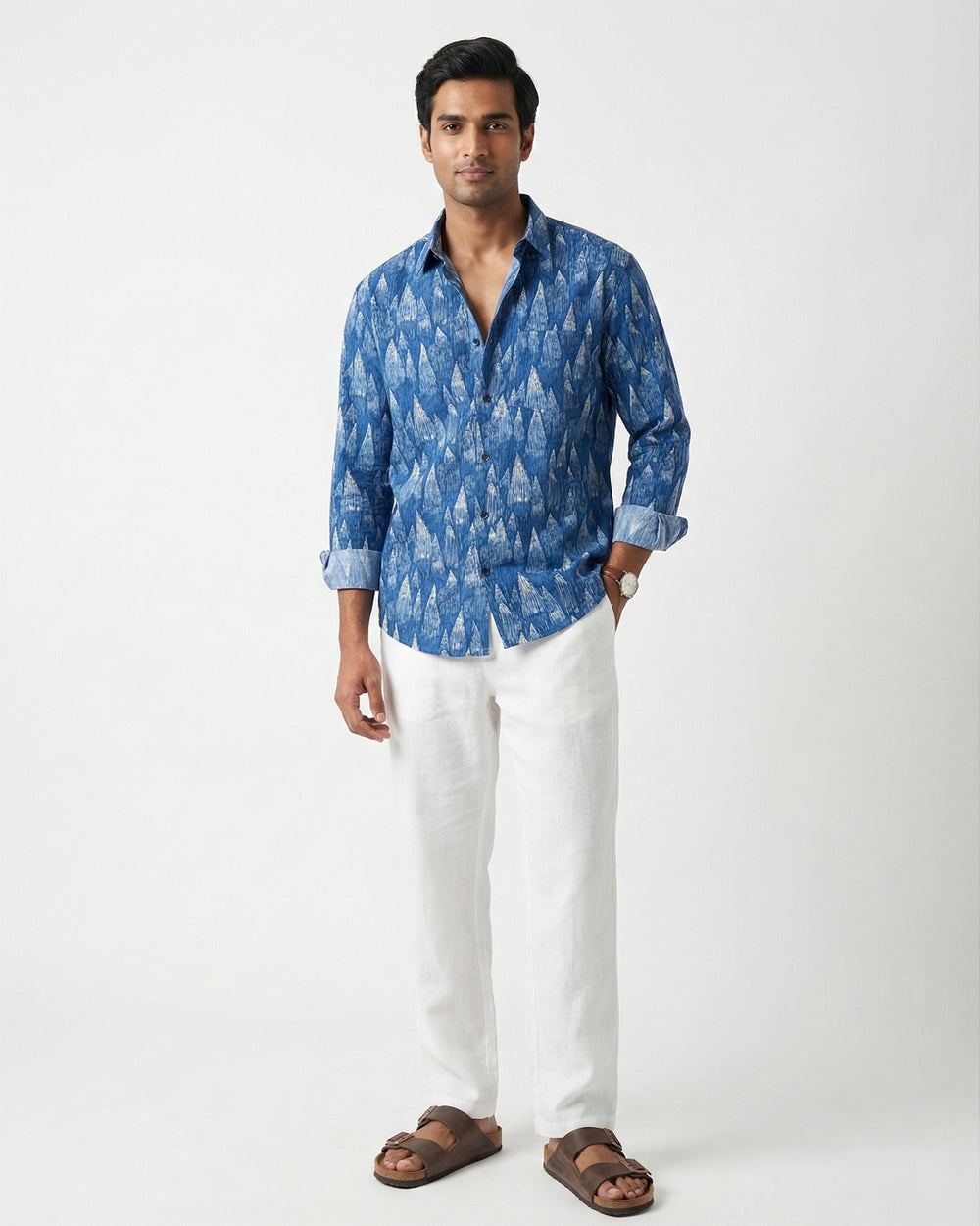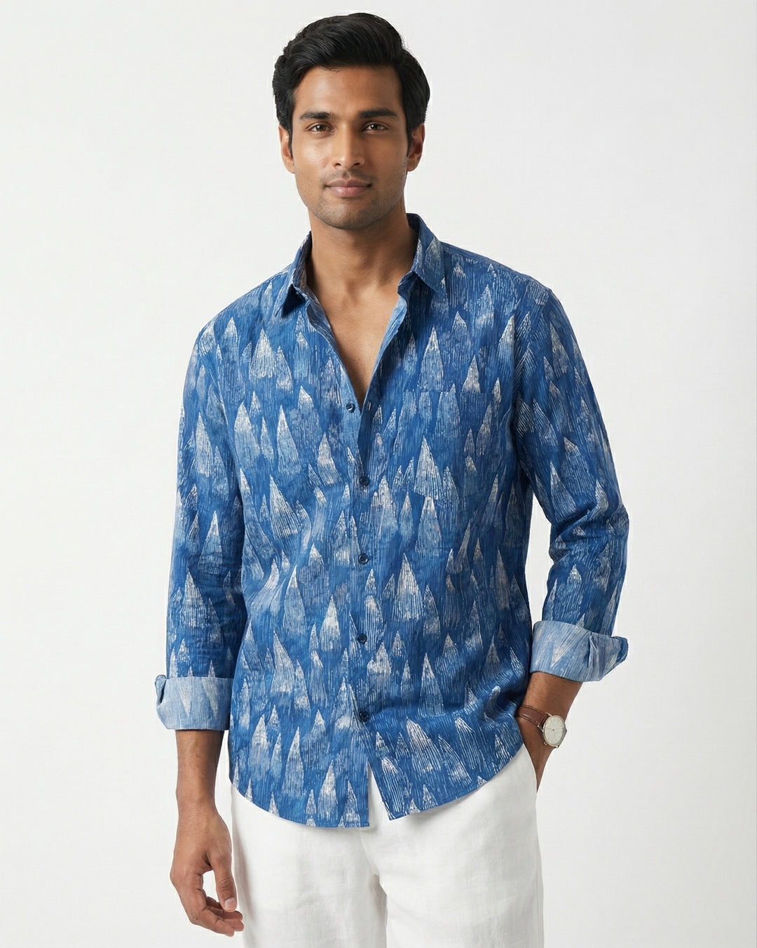 Navy Blue Ornate Cotton Poplin Half Sleeve Shirt